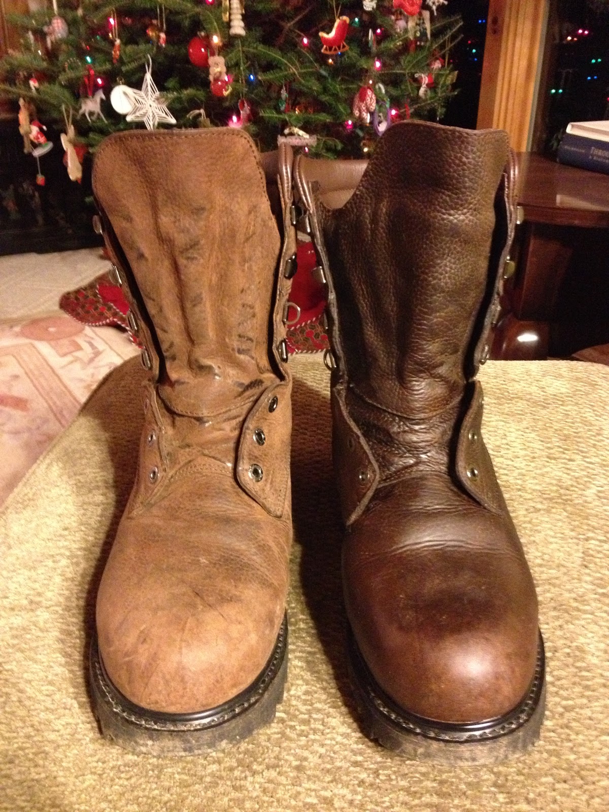 We had a nice wind storm around the holidays and lost power for several hours. Once I fired up the wood stove I thought it would be a good time to test out BearGuard. I warmed my boots, warmed the BearGuard, applied the BearGuard, then wiped off any excess. I waterproofed my Irish Setter Wingshooter boots first. Those came out pretty well, so I started on my Cabela’s deer hunting boots (below). Bear Guard does darken the leather on lighter colored boots, but it cleans them up nice.
